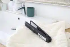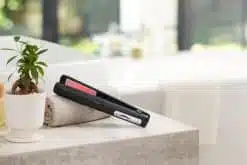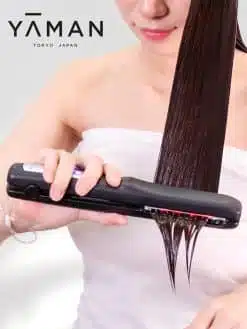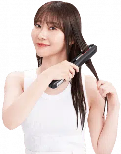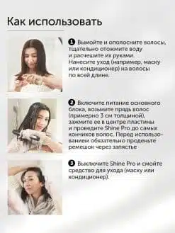 Негізгі құрылғының қуатын қосыңыз, шаш бұрымын (қалыңдығы шамамен 3 см) алыңыз, оны пластинаның ортасына қысыңыз және Shine Pro-ны шаштың ең ұштарына сырғытыңыз.* Қолданар алдында бауды білегіңізден өткізуді ұмытпаңыз.