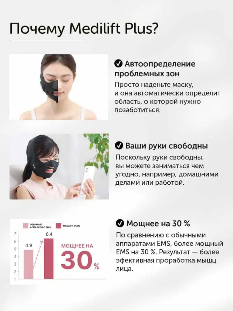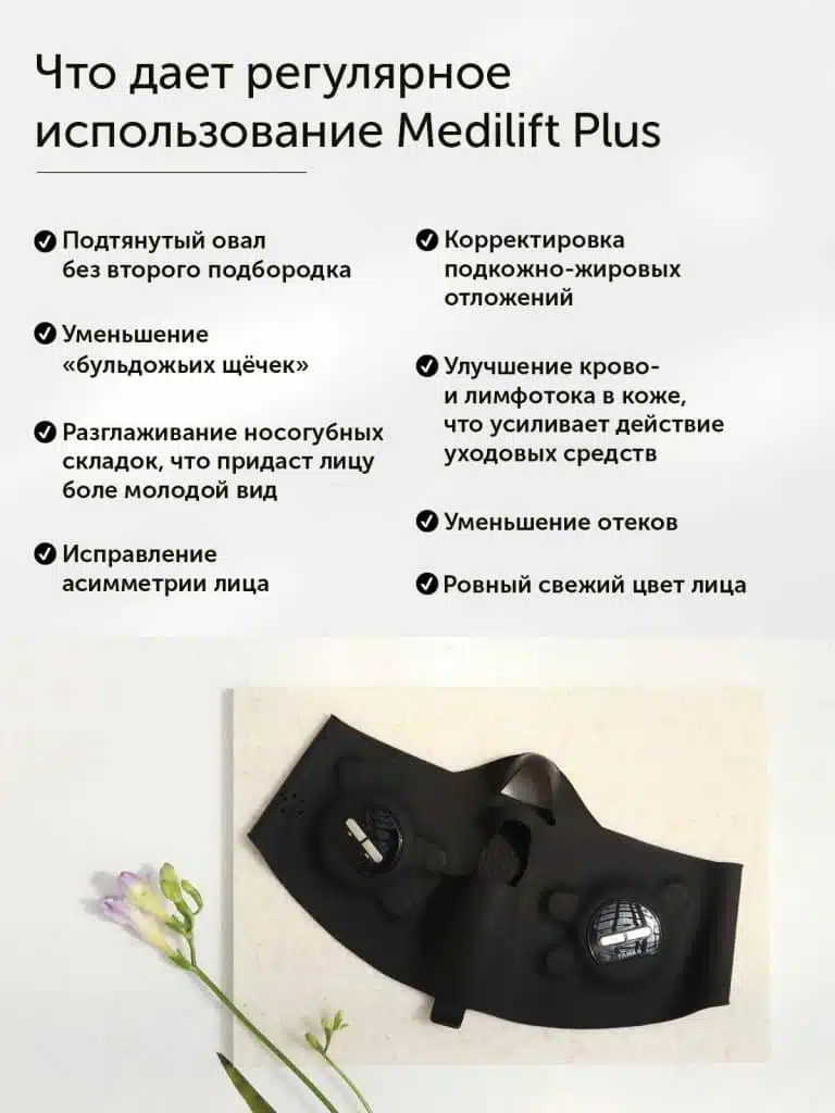 Medi Lift Plus помогает ускорить и поддерживать результаты процедур для лица с помощью простой программы ухода в домашних условиях. Всего за 10 минут в день, без помощи рук, без посещения косметолога.