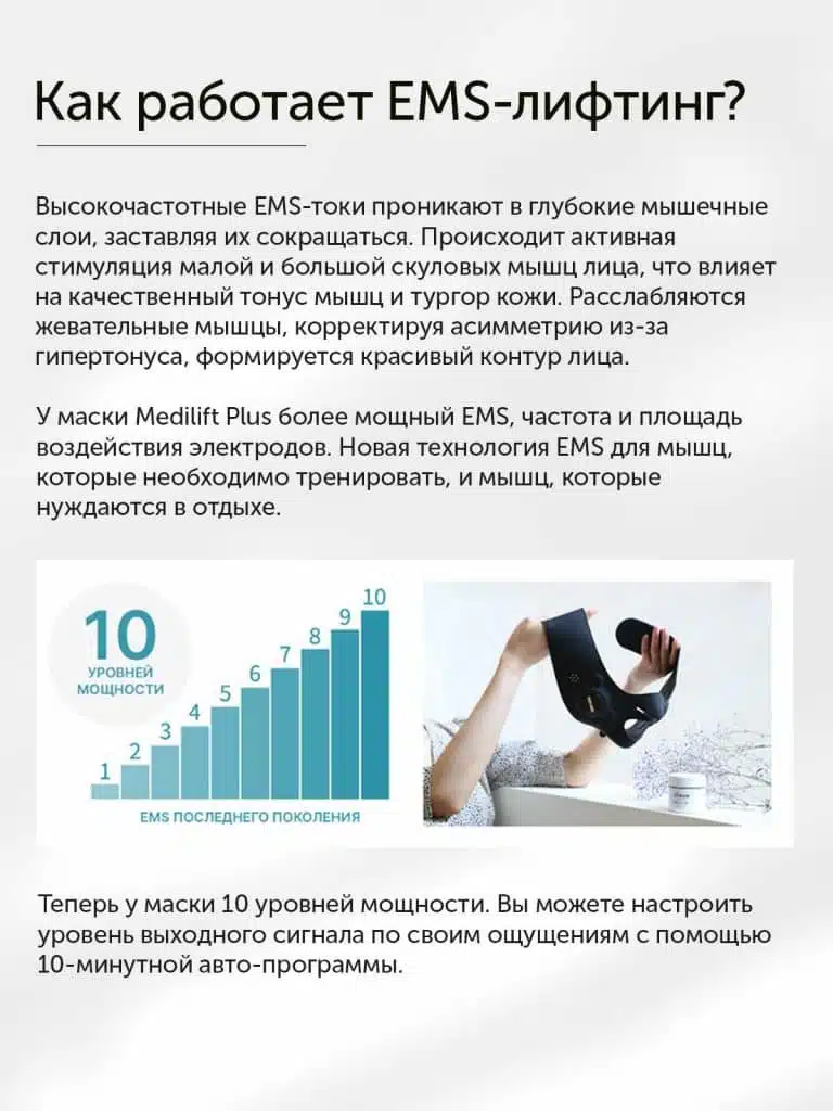 Маска просто🔥.!!! Результат меня порадовал с первого раза, я сразу перешла на третий уровень, мне было комфортно!!! Я конечно , не знаю сможет ли он подтянуть уже старое, обвисшее лицо, но я взяла для поддержания… так как год назад делала операционный смас лифтинг и очень надеюсь , что с этой маской я смогу надолго сохранить свой новый овал лица… Ощущения после маски приятные, немного побаливали скулы, но меня это даже обрадовало, значит действительно маска работает… Кожа после процедуры бархатистая, напитанная и как буд то светится изнутри… Однозначно ставлю пять звёзд и рекомендую к покупке. Цена конечно ,не маленькая, но я думаю это все окупится, потому что к косметологу больше точно ходить не буду. Спасибо 🙏 продавцу, потому что здесь самая низкая цена