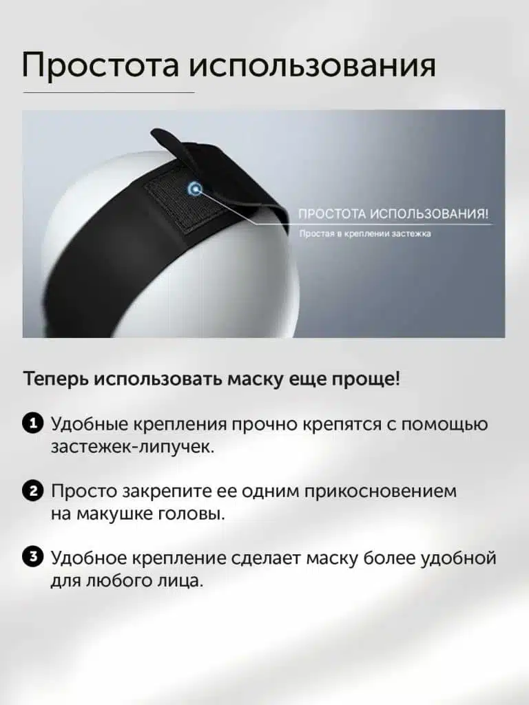 Теперь использовать маску еще проще! Просто закрепите ее одним прикосновением на макушке головы. Удобное крепление делает маску удобной для любого лица и размера головы.