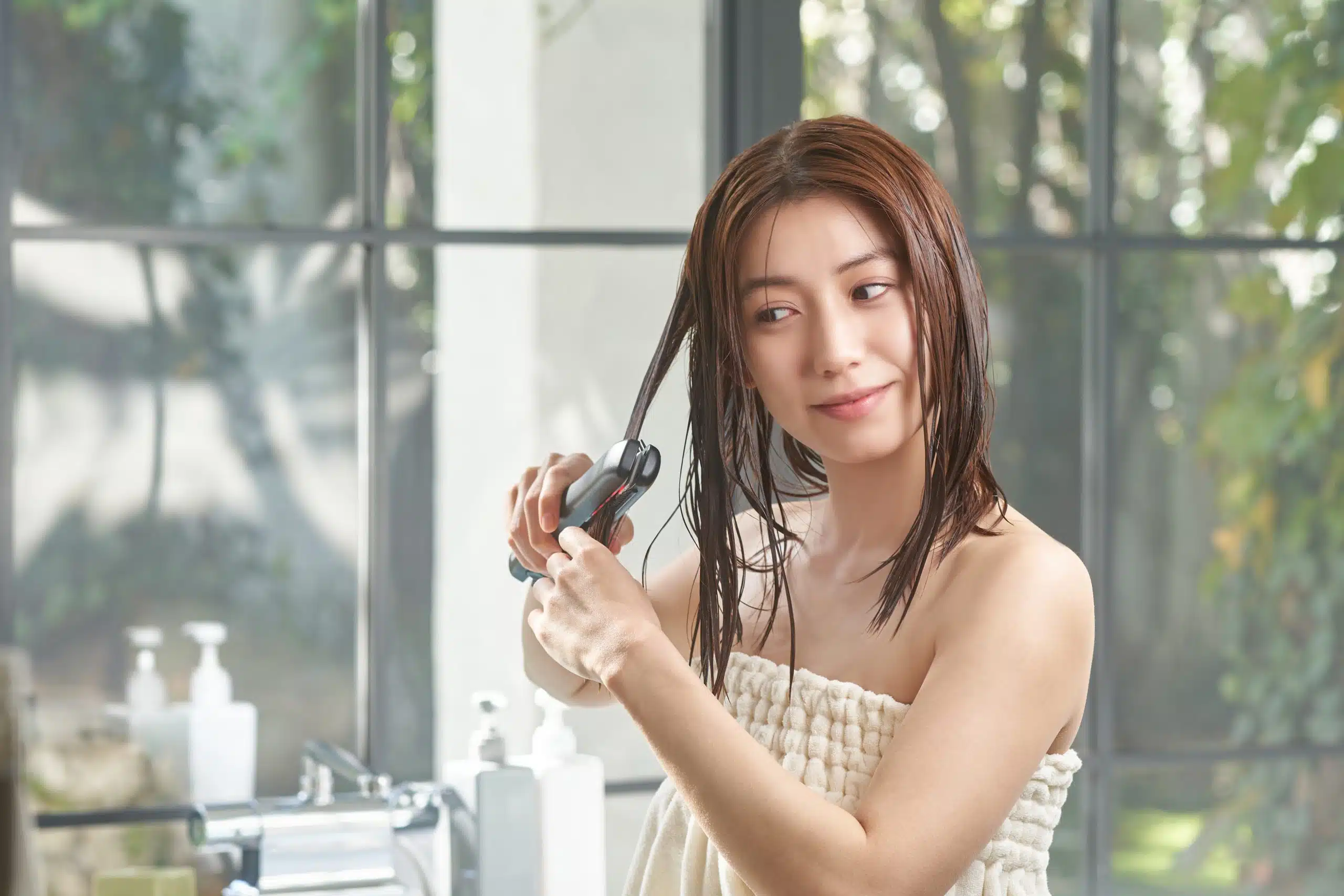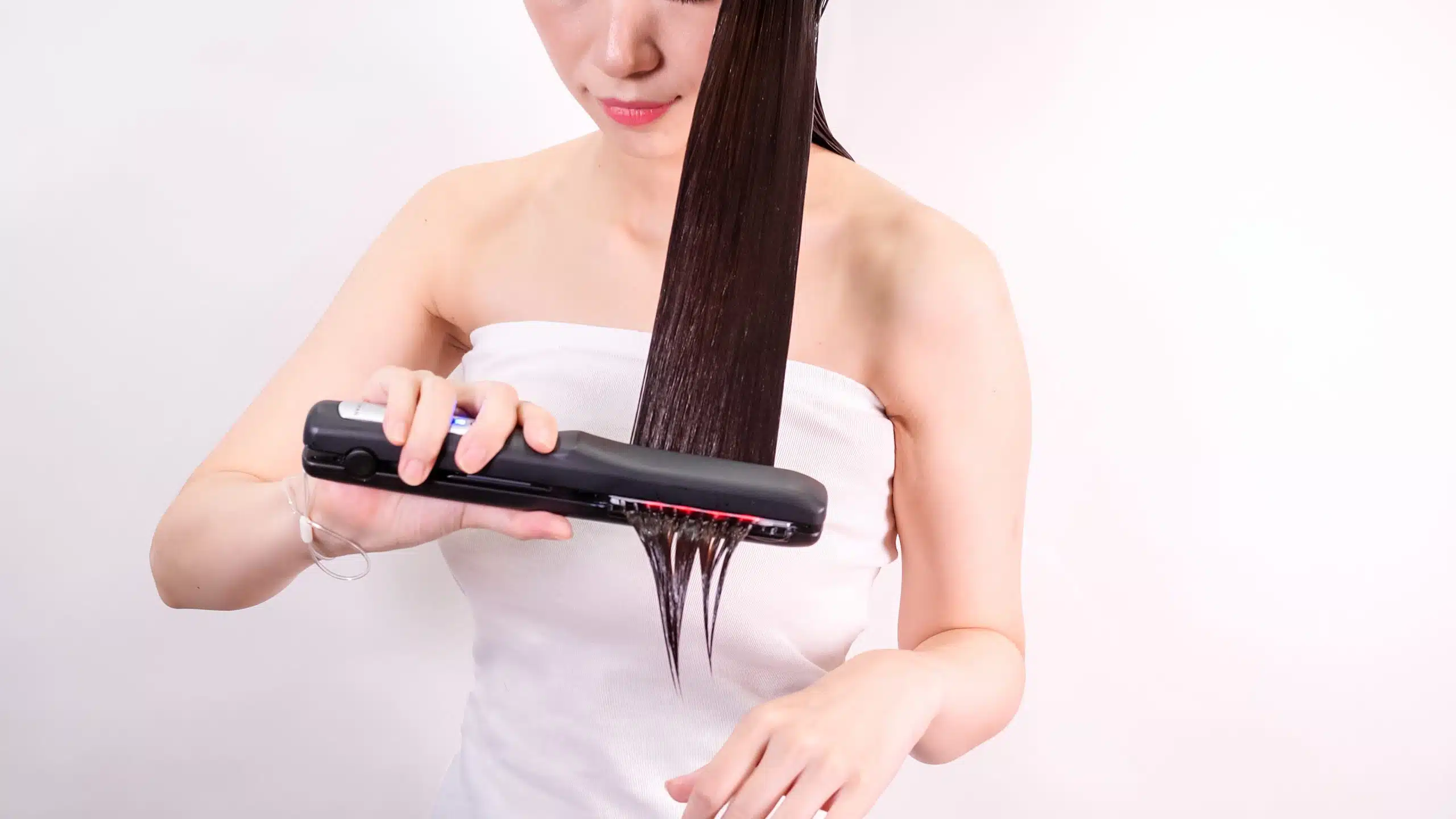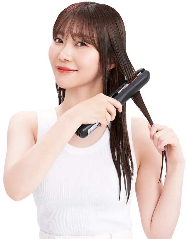 Включите питание основного блока, возьмите прядь волос (примерно 3 см толщиной), зажмите ее в центре пластины и проведите Shine Pro до самых кончиков волос.* Перед использованием обязательно проденьте ремешок через запястье.