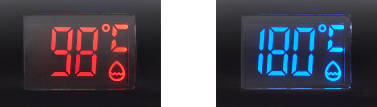 Когда прибор достигает заданной температуры, панель загорается синим.